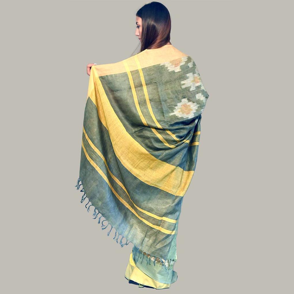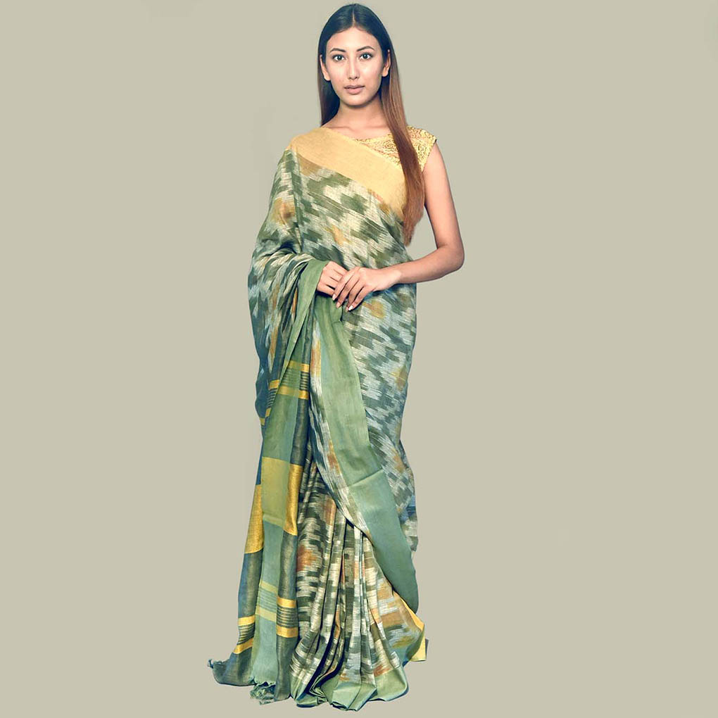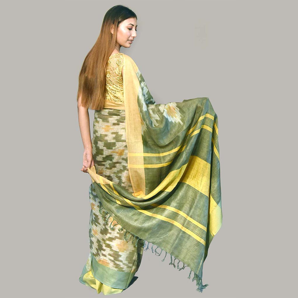 Graceful linen Ikat saree with striped aanchal and unstitched blouse piece. Light, elegant, and versatile—perfect for festive, formal, or casual wear with timeless appeal.