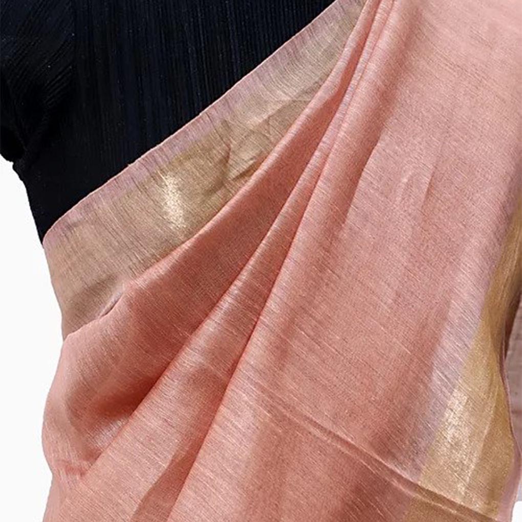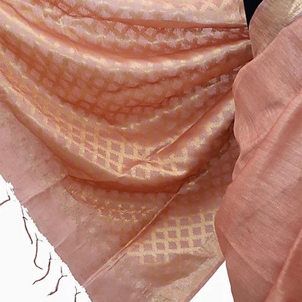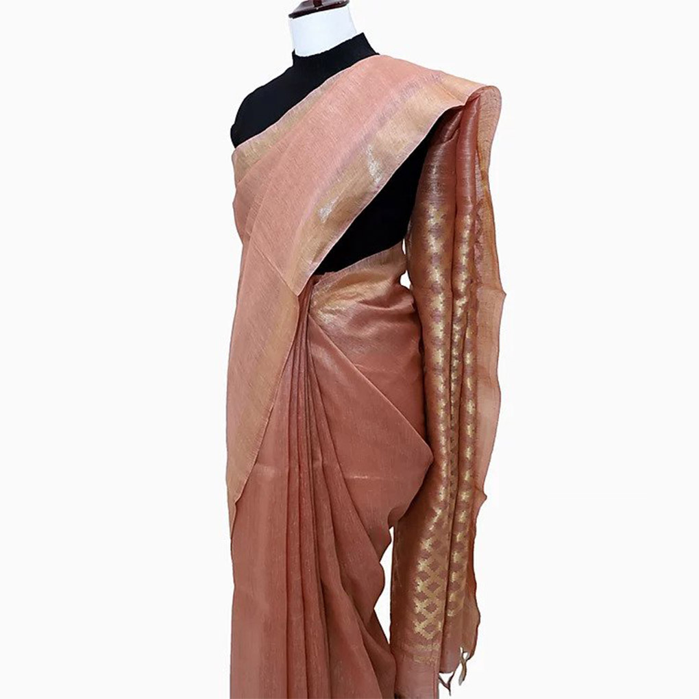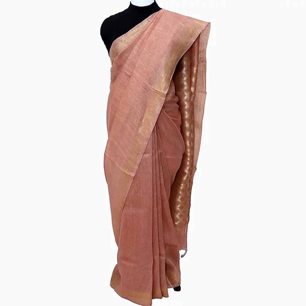 Elegant silk linen saree with argyle pattern and intricate zari work in jacquard weave. Includes unstitched blouse piece. A refined choice for festive, formal, or everyday wear.