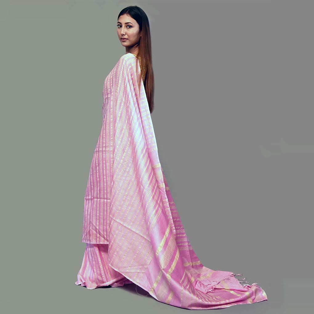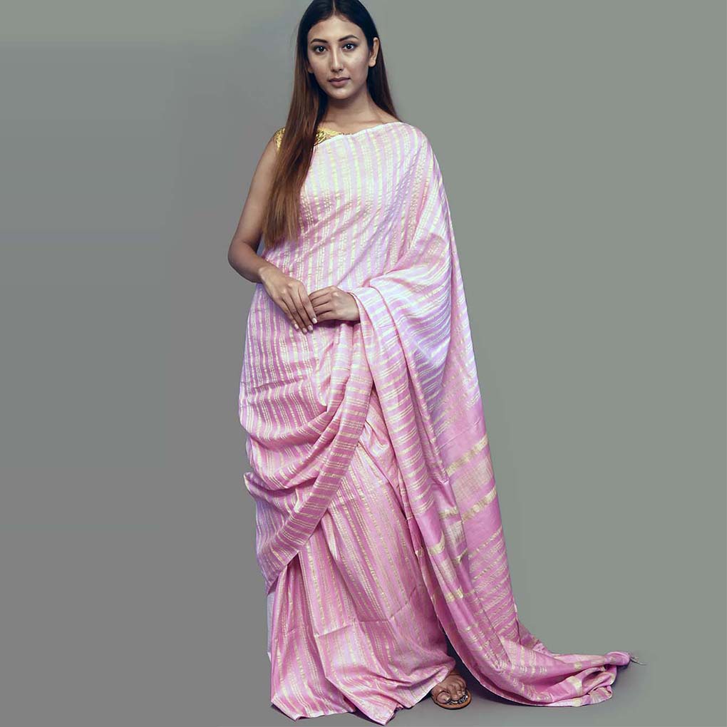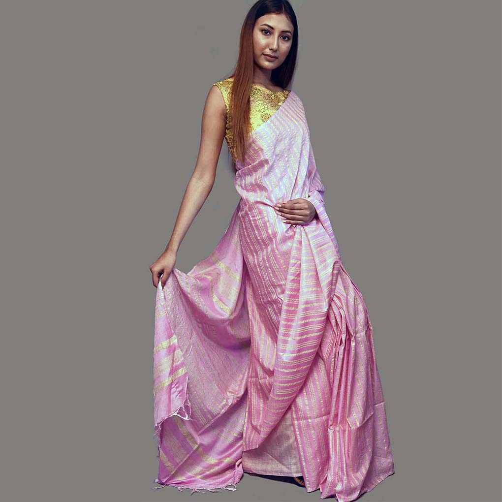 Chic pink linen saree with striped aanchal design, floor-length hemline, and unstitched blouse. Perfect for festive, formal, or daily wear. Fall and pico available on request.