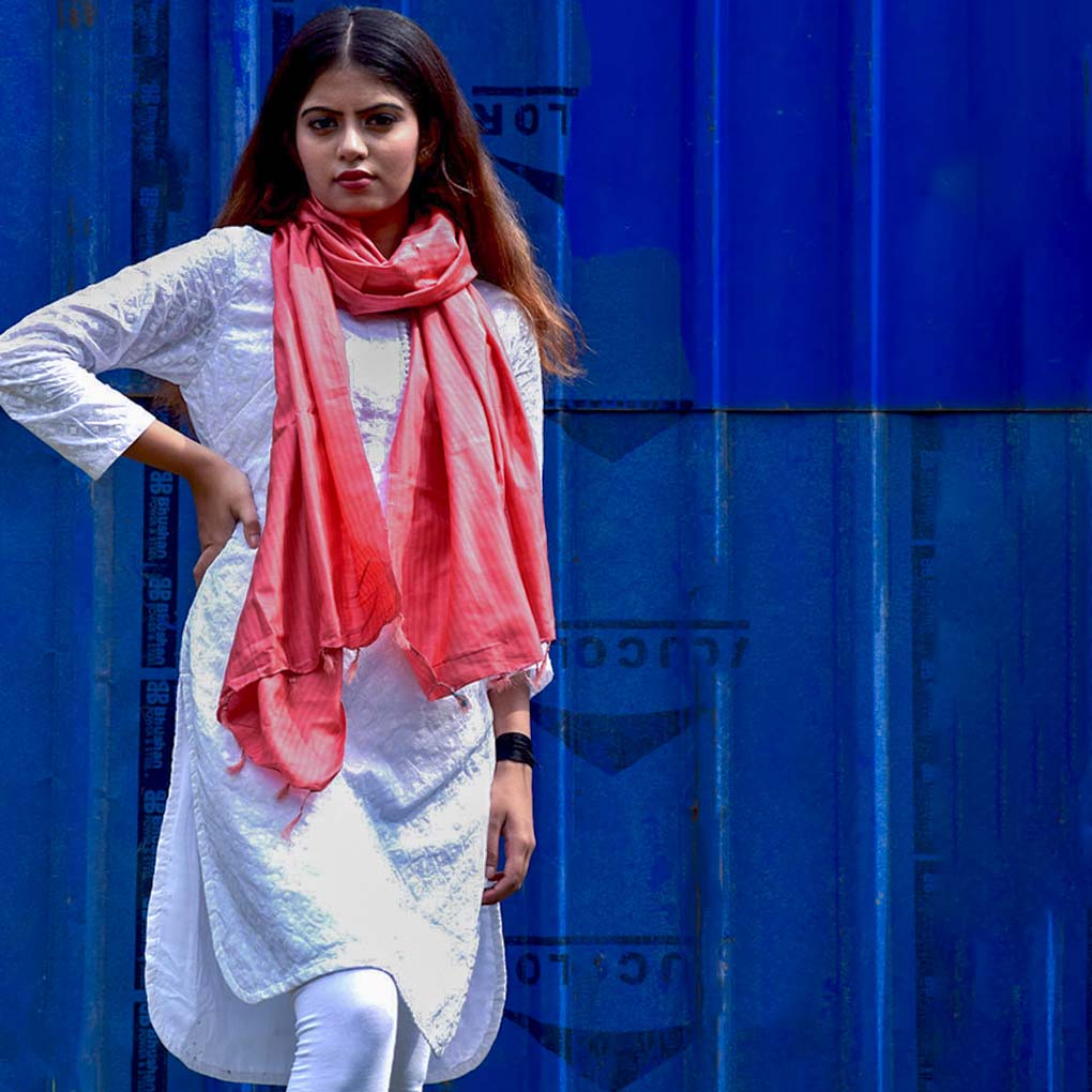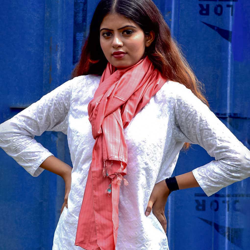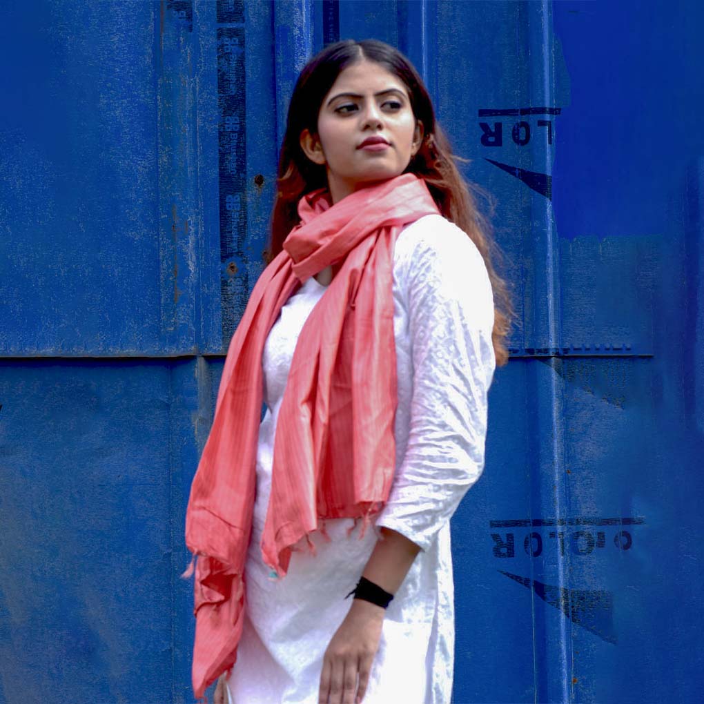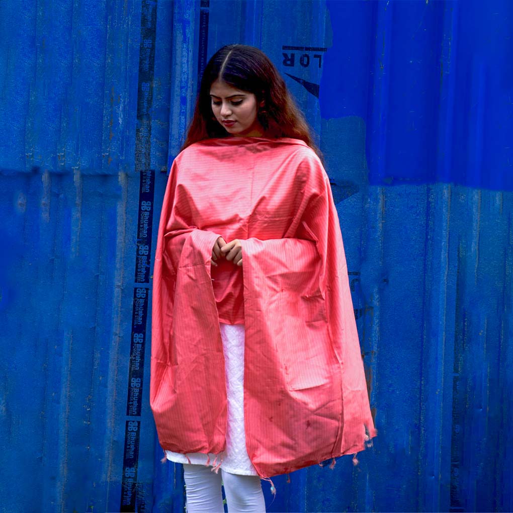 Handwoven red silk stole with elegant shadow stripes. Lightweight and stylish with a boho-hippie twist—perfect for elevating party, festive, or everyday looks with a pop of tradition and charm.