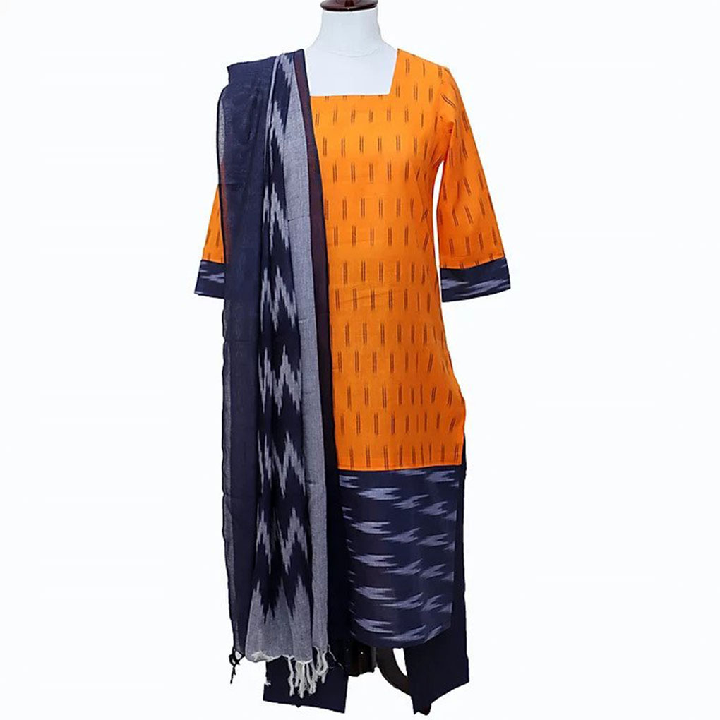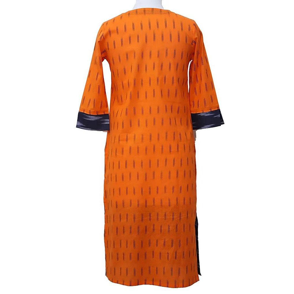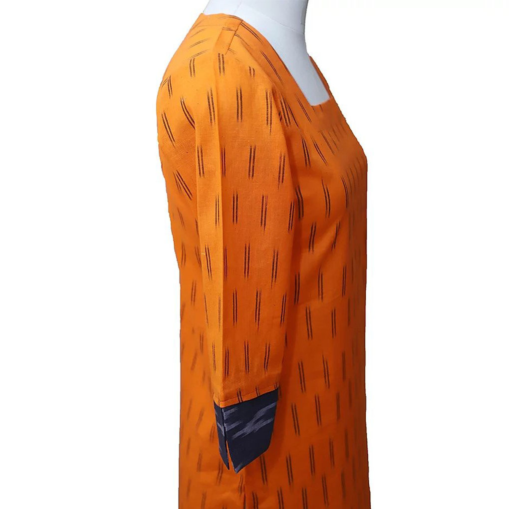 Vibrant orange peel shirt dress kurti in cotton with Ikat and abstract patterns. Features a square neck and three-fourth sleeves—perfect for festive, formal, or everyday wear.
