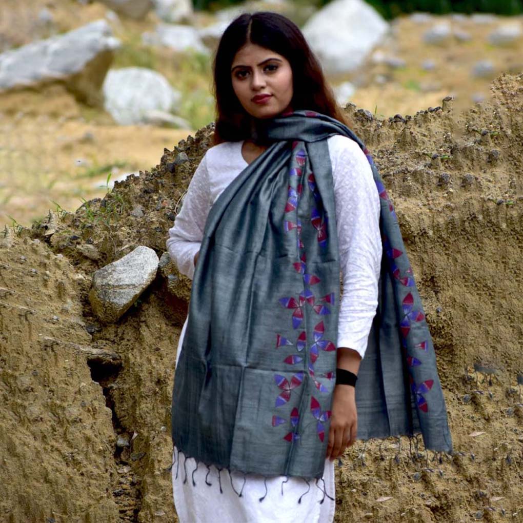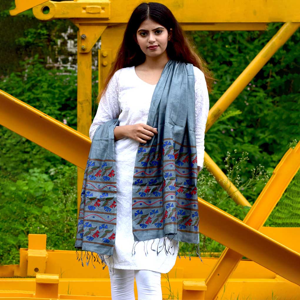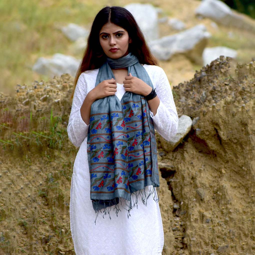 Grey silk stole with hand-painted geometric floral design, blending boho-hippie style with artistic elegance. Lightweight and expressive—ideal for parties, festivals, or daily wear with a creative ethnic touch.